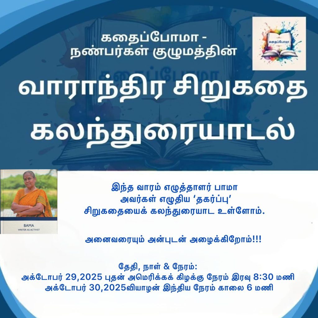 - கதைப்போமா நண்பர்கள் குழுமம் நடத்தும் சிறுகதை கலந்துரையாடலில், அடுத்து பாமா எழுதிய “தகர்ப்பு” சிறுகதை.