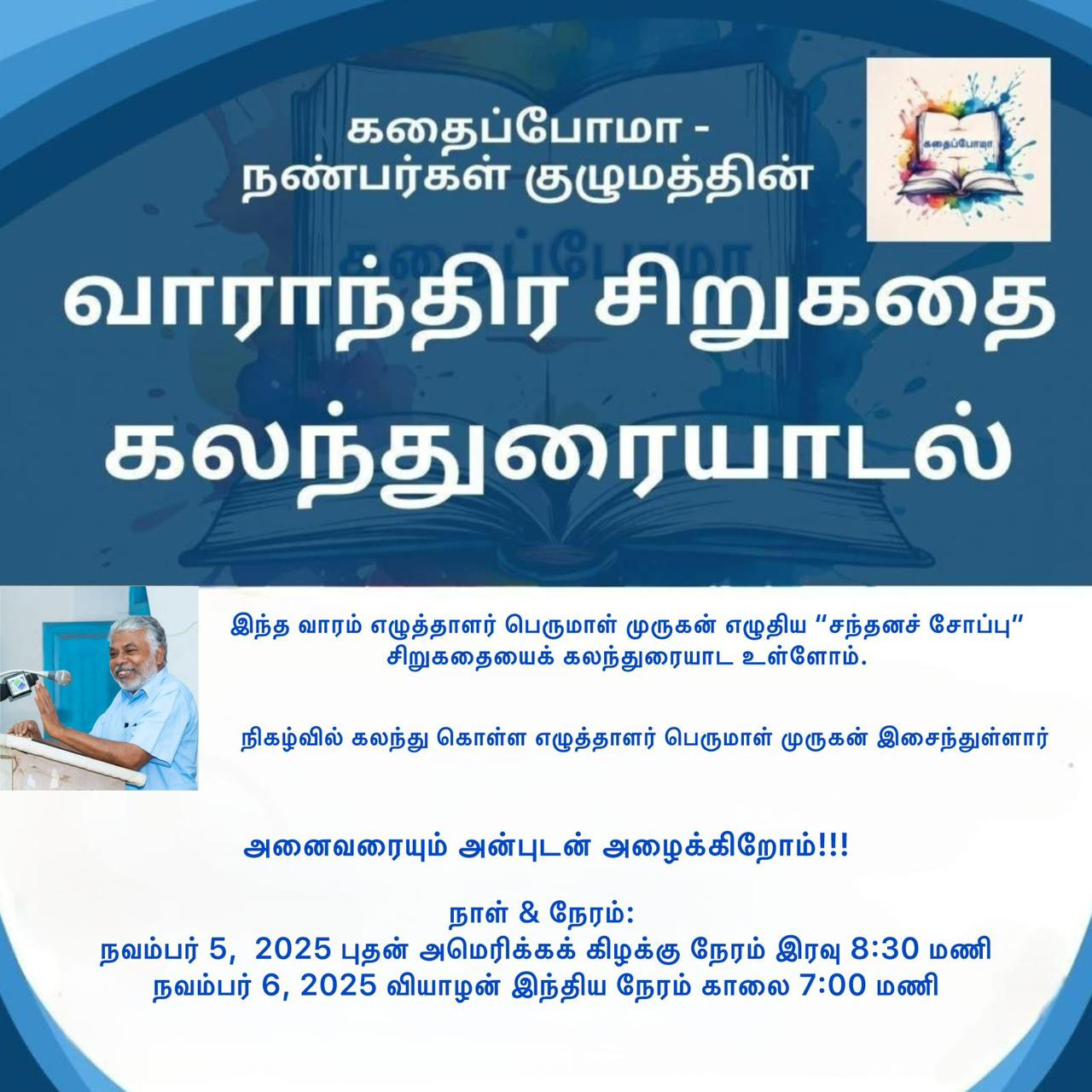 - கதைப்போமா நண்பர்கள் குழுமம் சிறுகதை கலந்துரையாடல் – பெருமாள் முருகன் எழுதிய “சந்தனச் சோப்பு”