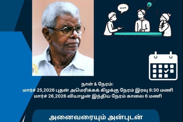 புதிய பார்வைகள் பெறும்போதுகதைகள்புதிய கதைகளாகி விடுகின்றன.- பி.கே. சிவகுமார் கதைப்போமா நண்பர்கள் குழுமம் நடத்தும் சிறுகதை கலந்துரையாடலில், அடுத்து சார்வாகன் எழுதிய “நாதப்பிரும்மம்” சிறுகதை. நாள் & நேரம்:மார்ச் 11 2026 புதன் அமெரிக்கக்…